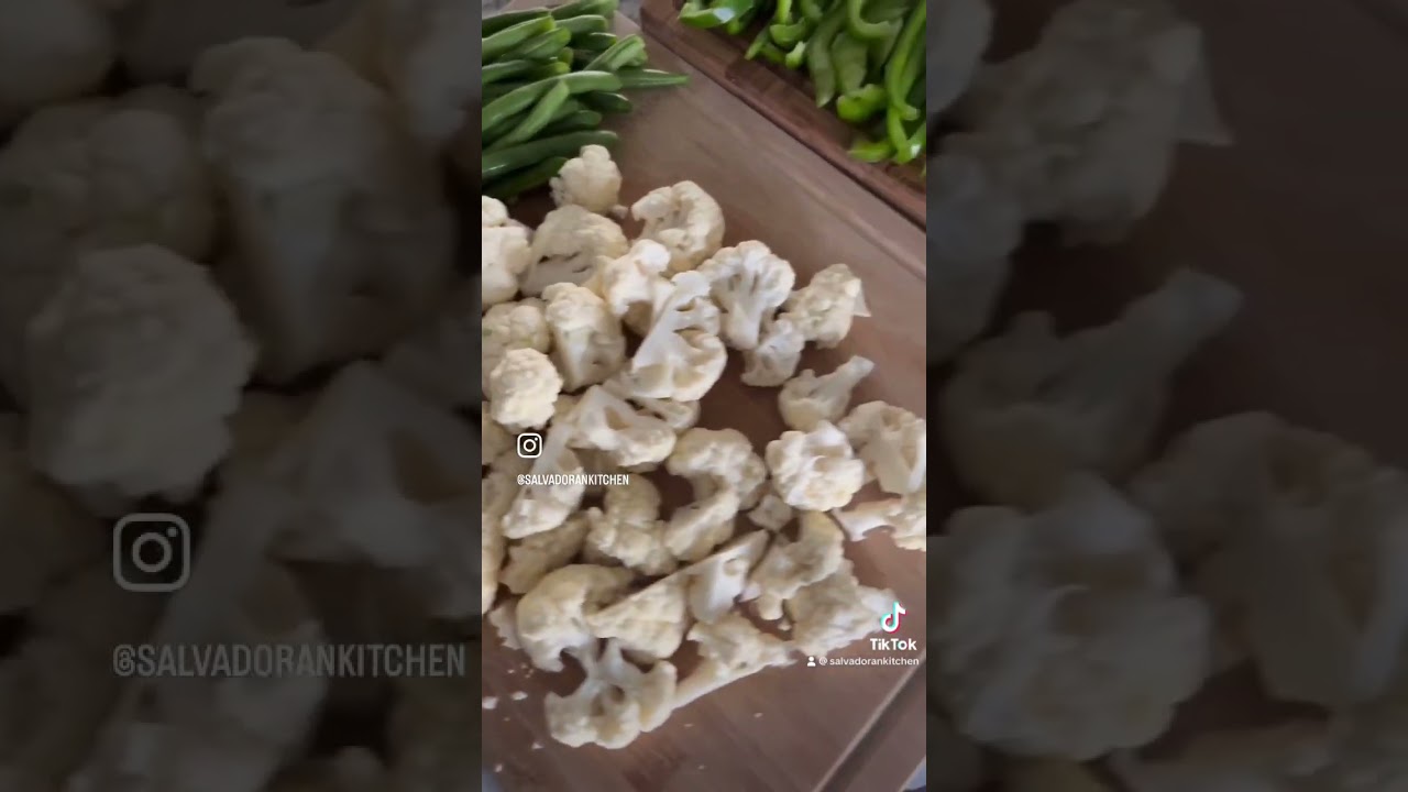 - Once you have all of your veggies cut and ready. Place cauliflower and green beans together in a bowl. Add boiling water to cover them. Leave them there for 10-15 minutes.